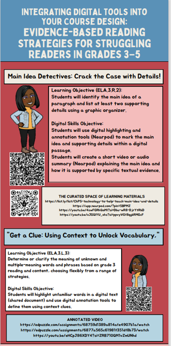 This blended learning unit integrates technology, collaborative learning experiences, and continuous reflection. Teachers will build both confidence and competence in delivering effective literacy instruction. The use of formative and summative assessments, supported by digital tools, ensures that learning is personalized, feedback is timely, and instructional growth is ongoing. By the end of the unit, participants will have developed a portfolio of practical strategies and resources, demonstrating their commitment to continuous improvement and their readiness to meet the diverse needs of struggling readers in their classrooms.