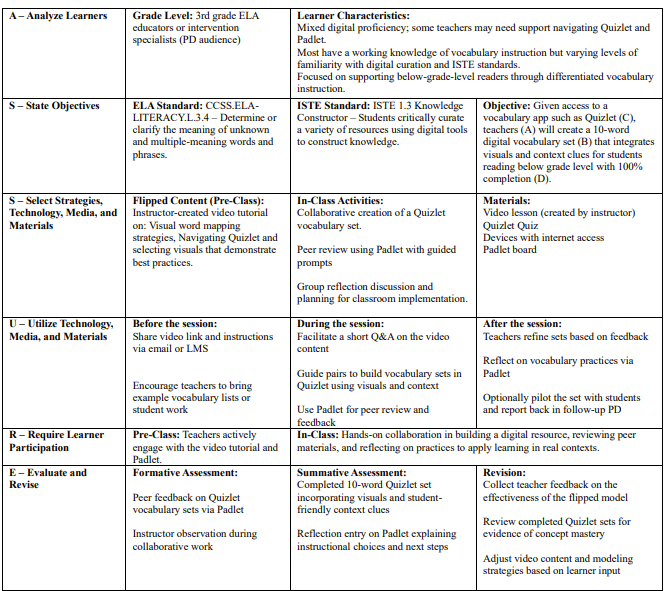 The use of digital tools not only supports differentiated instruction but also aligns with ISTE standards that empower students as knowledge constructors (ISTE, 2016). Through peer review, reflection, and optional classroom implementation, teachers will leave this PD with practical strategies they can immediately apply. Continued support will be provided through shared Padlet feedback and future check-ins, fostering a professional community focused on innovative vocabulary instruction, one word at a time.