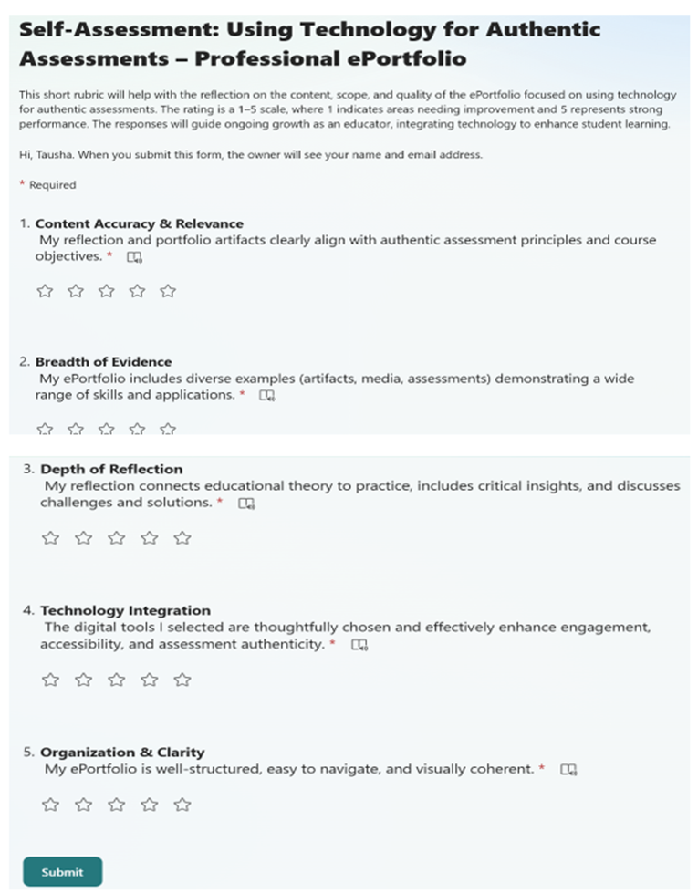 Finally, I created the self-assessment rubric to evaluate key aspects of my professional ePortfolio, emphasizing reflection quality and effective technology use for authentic assessments. The criteria include content accuracy to ensure alignment with course goals (Barrett, 2010), breadth of evidence to showcase diverse applications of blended learning (Ashraf et al., 2021), and depth of reflection to connect theory with practice and promote growth (Guskey, 2002). Technology integration assesses the purposeful use of digital tools following ISTE standards (ISTE, 2022), while organization and clarity focus on making the portfolio accessible and coherent (Barrett, 2010). Together, these criteria support meaningful self-reflection and ongoing improvement based on educational best practices.