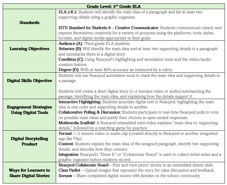 Digital storytelling is an adaptable and dynamic assessment strategy. It enables students to synthesize content, demonstrate creativity, and communicate their ideas to authentic audiences. Whether documenting a science experiment, explaining a math concept, reflecting on personal experiences, or advocating for a social issue, digital storytelling fosters deeper engagement and critical thinking. Its flexibility across grade levels, subject areas, and learner
